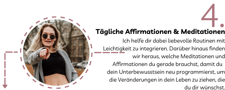 Jeden Morgen wache ich mit positiver Energie und erfüllt von Dankbarkeit auf. Meine Emotionen und Gedanken nehme ich liebevoll und verantwortungsbewusst an und kann endlich ICH SELBST sein – authentisch mit all meinen Facetten. Ich lasse mich nicht mehr von anderen Menschen beeinflussen, sondern lebe das Leben, welches ich führen möchte, ohne die Angst, ob andere Menschen mich mögen oder nicht.