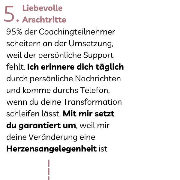 Sara hat gelernt ihre negativen Glaubenssätze endgültig loszulassen und wahre Grenzen zu setzen. Sie hat nun liebevolle Routinen integriert und geht mit viel mehr Sicherheit und Selbstbewusstsein durch´s Leben.
